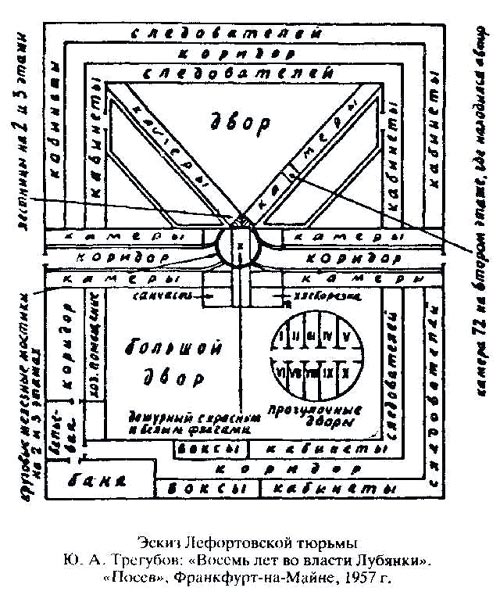 Три корпуса тюрьмы расположены буквой «К»; вход в камеры - с галереи или мостиков; все три этажа - сквозные. В 20-х г. г. после самоубийства нескольких подследственных, междуэтажные проемы были затянуты металлической сеткой. В месте, где сходятся корпуса, образующие «К», надзиратель с флажком сигнализирует свободен ли путь (см. щелкание 1. - 2. В главном здании 260 одиночек. В середине 30-х г. г. в каждой из них поставили по две 2-ярусн. койки, занимающие почти 0,75 площади камеры. Еще в царское время стали расширять тюрьму. Работы закончены при Сов. власти и корпуса, образующие «К», теперь укрыты в квадрате более высоких зданий, в которых расположены кабинеты следователей и дополнительные камеры. - 3. Во время сталинских чисток Л. т. славилась совершенно особыми пытками. Некоторые подследственные, когда им говорили об их отправке в Л., соглашались подписать что угодно. Так же известны лефортовские карцера (см. карцер 41.) - 4. В конце 20-х г. г. по соседству с Л. т. был открыт ЦАГИ и с тех пор вой аэродинамической установки ЦАГИ оглушает подследственных. В годы сталинских чисток коридоры и камеры Л. т. были выкрашены в черный цвет. Л.-расстрельная тюрьма. Перед высылкой из Советского Союза в 1974 г., Солженицын провел несколько дней в Л. т.