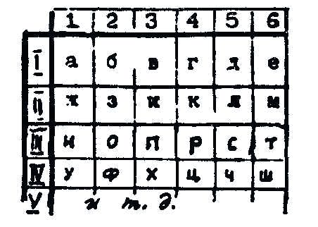 (Б. жаргон) морзянка - азбука Морзе; см. телеграф. Тюремная м. заменяет точку одним ударом (в стену соседней камеры), а тире-двумя быстрыми. Оч. часто применяется другая система, где первый удар обозначает ряд, а второй - букву в ряду (см. схему). После каждого переданного слова передающий царапает стену и ожидает подтверждение принимающего. Если тот подтвердит (один удар), тогда передается следующее слово. В противном случае вновь передается последнее слово. Три удара означают «повтори!». Три удара или больше означают, что передающий ошибся и повторит переданное. Применяется еще и другая система, так называемая Бестужевская азбука (нач. ХIX века).
