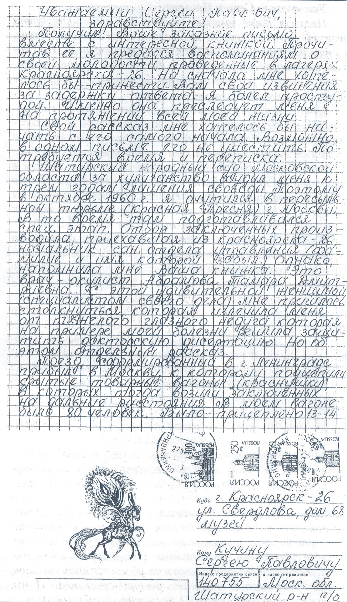 Получил Ваше заказное письмо, вместе с интересной книжкой об истории города. («События, люди» С.П.Кучин, МВЦ Красноярск-26, 1994 г.)