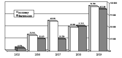 В итоговых показателях картина была следующей: сумма реализованных капиталовложений в этом году составляла 51830 тыс. руб. или 103,6% утвержденного плана в размере 50000 тыс. руб., причем при отсутствии перерасхода финансовых средств. Однако нужно отметить, что первоначально в этом году был установлен более высокий план в размере 60000 тыс. руб., который был снижен только в октябре месяце [84]. Тем не менее, достигнутый в 1938 г. уровень капиталовложений был примерно вдвое выше, чем в предыдущем году, так что прогресс в развертывании строительных работ после начала нормального железнодорожного передвижения уже проявился в итогах 1938 г. Это также видно из диаграммы на Рисунке 1, на котором сопоставляются данные по уровню плановых и реальных капиталовложений за 1935—1939 гг.