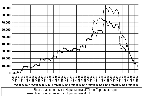 Как видно на Рисунке 2, количество заключенных в начальный период Норильлага было сравнительно небольшим, по крайней мере, по сравнению с последующими годами. Так, к середине 1940-х гг. численность заключенных Норильлага составляла уже около 40000 чел., а в начале 1950-х гг., вместе с заключенными Горного лагеря (Особого лагеря №2, организованного в 1948 г. на базе бывших лагерных отделений Норильлага), достигала более 90000 чел.