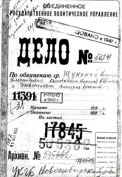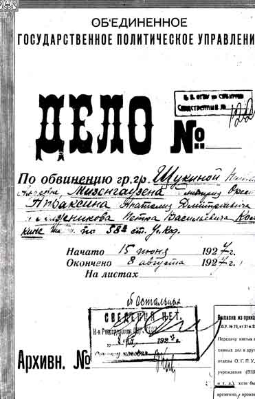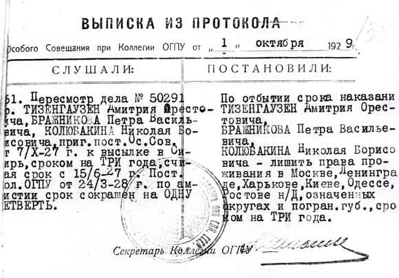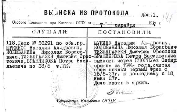 Имеются еще две выписки из протоколов: от 7 октября 1927г. и от 24 марта 1928г. В них уже упоминаются остальные участники «дела» и указывается, что срок ссылки на 3 года первым трем, то есть Щукиной, Колюбакину и Тизенгаузену насчитывается с 15 июня 1927г., а Бражникову – с 18 июня 1927г. Последняя строка гласит: «Дело сдать в архив». В протоколе же от 24 марта 1928г. сказано все то, что мы уже знаем, но имеется интересная приписка от руки: «12.11.1929. РСО ПП ОГПУ сообщает, что адм. ссыльный Д. О. Тизенгаузен от ссылки освобожден и выбыл к избранному месту жительства г. Канск».