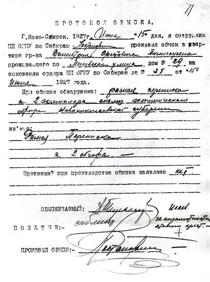Итак, 15 июля 1927г. на квартиру к Дмитрию Орестовичу является с ордером на обыск сотрудник ПП ОГПУ Костандогло с понятыми Саблиным и Исаевым, который «за неграмотностью ставит крест вместо подписи».