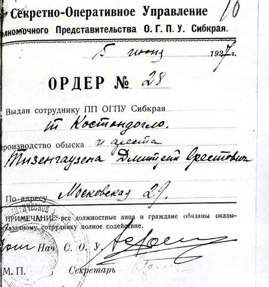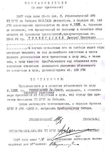 «1927г. июня 18 дня. Я, уполномоченный КРО ПП ОГПУ по Сибкраю Шульдаль, рассмотрев, в порядке ст. 143 УПК следственное производство по делу №1228 и, принимая во внимание, что привлеченный по таковому в качестве обвиняемого, по признакам преступлений, предусмотренных ст. 58-5 УК гр. Тизенгаузен Дмитрий Орестович… в случае оставления его на свободе может отрицательно повлиять на ход дальнейшего следствия в части полного установления всех причастных к делу лиц, а также, что, в силу тяжести предъявленного ему обвинения есть основания опасаться возможного уклонения обвиняемого от следствия и суда, руководствуясь ст. 158 УПК постановил: