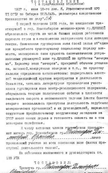 С первой половины 1926г., по инициативе практикующей в гор. Новосибирске женщины-врача гр. ЩУКИНОЙ образовалась группа из числа бывших видных работников царского строя и антисоветски настроенного слоя интеллигенции. Означенная группировка, имея своей целью объединение враждебного существующему социальному порядку элемента, маскировала свою сущность систематически устраиваемыми упомянутой выше гр. ЩУКИНОЙ по субботам «вечерами». Характер этих «вечеров», прикрытый обычным угощением, выпивкой, концертными номерами и т. п. по существу являлся определенно антисоветским: подвергались злостной тенденциозной критике мероприятия и деятельность Соввласти, читались литературные произведения участников группировки явно контр-революционного содержания, обсуждались текущие политические события в плоскости ожидаемого скорого и несомненного падения Власти Советов, открыто восхвалялась преступная деятельность зарубежных монархических организаций и их руководителей, выражалось сочувствие предполагаемому вооруженному нападению на СССР иностранных держав и готовность оказать им в том всемерное содействие.