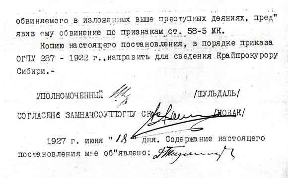 А сейчас – арестован «в Новосибирске, на своей квартире по Московской ул. № 29 17 июля 1927г.». Уполномоченный КРО ПП ОГПУ по Сибкраю Шульдаль все эти сведения подтверждает в Протоколе, только что вносит еще и разъяснение: «С IX. 1922г. по XII. 1923г. был в заключении в гг. Иркутске и Н. Сибирске по обвинению в контр. рев. преступлении, находился под следствием, но сужден не был».