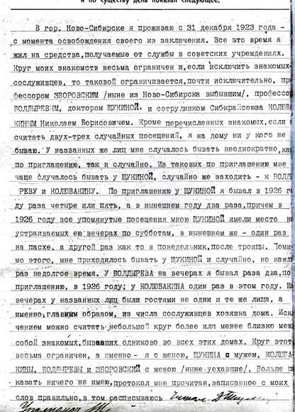 «В гор. Новосибирске я проживаю с 31 декабря 1923 года – с момента освобождения своего из заключения. Все это время я жил на средства, получаемые от службы в советских учреждениях. Круг моих знакомств весьма ограничен и, если исключить знакомых-сослуживцев, то таковой ограничивается, почти исключительно, профессором ЗБОРОВСКИМ (ныне из Новосибирска выбывшим), профессором БОЛДЫРЕВЫМ, доктором ЩУКИНОЙ, и сотрудником Сибкрайсоюза КОЛЮБАКИНЫМ Николаем Борисовичем. Кроме перечисленных знакомых, если не считать двух-трех случайных посещений, я на дому ни у кого не бываю. У названных же лиц мне случалось бывать неоднократно, как по приглашению, так и случайно. Из таковых по приглашению мне чаще случалось бывать у ЩУКИНОЙ, случайно же заходить – к БОЛДЫРЕВУ и КОЛЮБАКИНУ. По приглашению у ЩУКИНОЙ я бывал в 1926 году раза четыре или пять, а в нынешнем году два раза, причем в 1926 году все упомянутые посещения мною ЩУКИНОЙ имели место на устраиваемых ею вечерах по субботам, в нынешнем же – один раз на пасхе, а другой раз как-то в понедельник, после троицы. Помимо этого, мне приходилось бывать у ЩУКИНОЙ и случайно, но каждый раз недолгое время. У БОЛДЫРЕВА на вечерах я бывал раза два, по приглашению, в 1926 году; у КОЛЮБАКИНА один раз в этом году. На вечерах у названных лиц были гостями не одни и те же лица, а именно, главным образом, из числа сослуживцев хозяина дома. Исключением можно считать небольшой круг более или менее близко между собой знакомых, бывавших одинаково во всех этих домах. Круг этот весьма ограничен, а именно – я с женою, ЩУКИНА с мужем, КОЛЮБАКИНЫ, БОЛДЫРЕВЫ, и ЗБОРОВСКИЙ с женою (ныне уехавшие). Больше показать ничего не имею, протокол мне прочитан, записанное с моих слов правильно, в том расписываюсь».