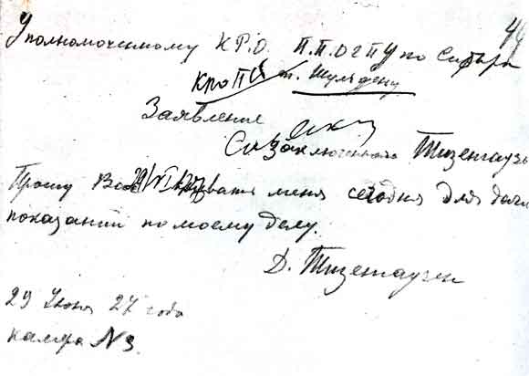 И началось заключение. В архивных папках сохранилось два заявления заключенного Тизенгаузена. 25 июня 1927г. он пишет на имя Шульдаля: «Прошу Вас вызвать меня сегодня для дачи показаний по моему делу. Д. Тизенгаузен. 29 июня 1927г. камера №3».