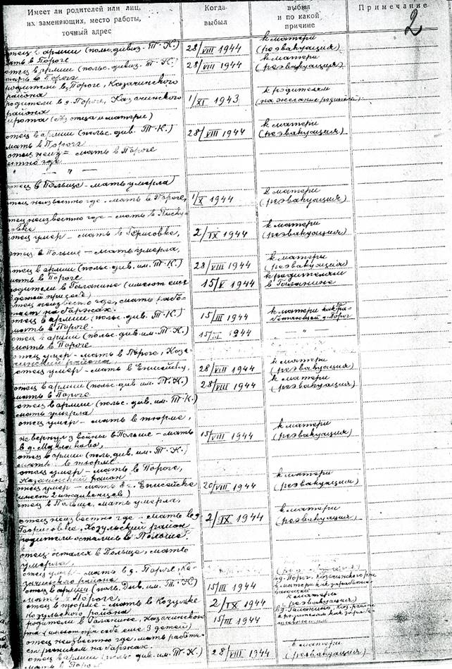 Детские дома эвакуировались вместе со всеми: Мало-Минусинский и Больше-Ербинский польдетдома выехали на родину эшелоном № 69 27 марта со ст. Абакан, Порожский - эшелоном № 71 10 апреля 1946 года со ст. Ачинск. Воспитанники и персонал детских домов также получили продукты, необходимую одежду и денежную помощь. По сводкам «Упрособторга» об отправке им было выдано 2304 банки рыбных консервов, 1584 банки молочных консервов. На узловых станциях их снабжали хлебом и горячим питанием. Телеграммы о необходимости снабжения поляков в пути и контроля за этим отправлялись из Москвы и из пунктов следования эшелонов ежедневно.*** (*** ГАКК, ф.р-1330, оп.1, д.16, л.л.40-61.)