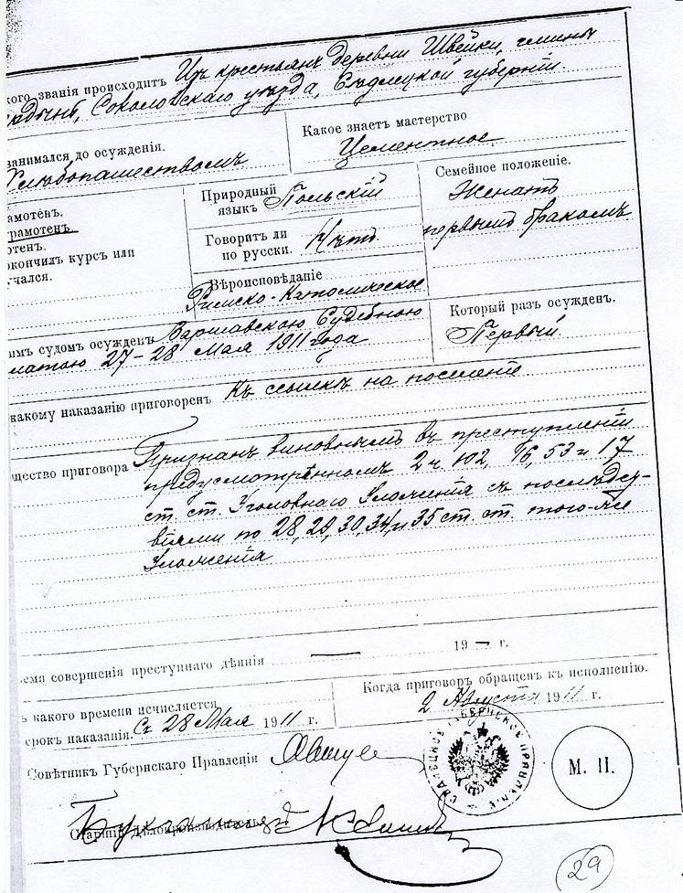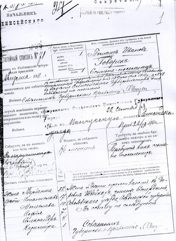 15 мая 2003 года я просмотрела документы в Красноярском Краевом архиве фонд 595, опись 63, т. 4-243 за 1908-1917, которые содержали информацию о «Томашъ Иванов Говорек». Узнала, что он был выслан на поселение 22 сентября 1911 года в Пинчугскую волость Енисейского уезда. (Копии документов прилагаются).