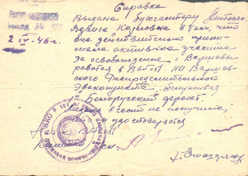 Принимала участие в боях за освобождение Варшавы в составе Варшавского Распределительного Эвакопункта, обслуживая 1-ый Белорусский фронт, участвовала в обороне г. Москвы.