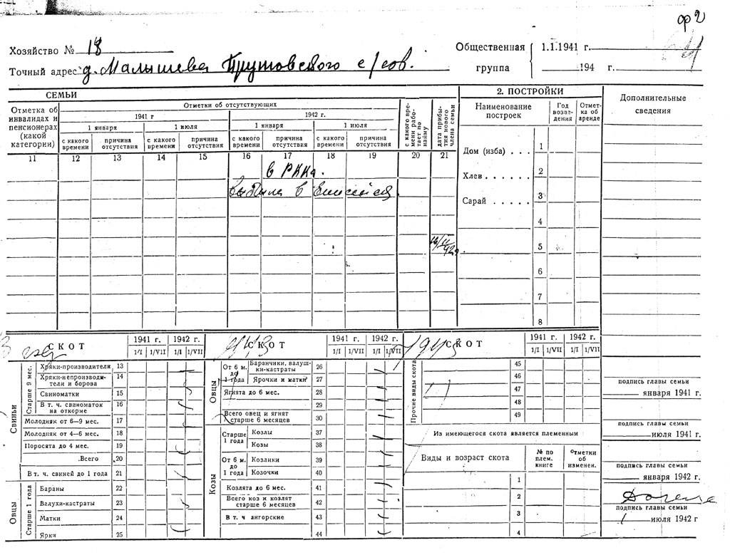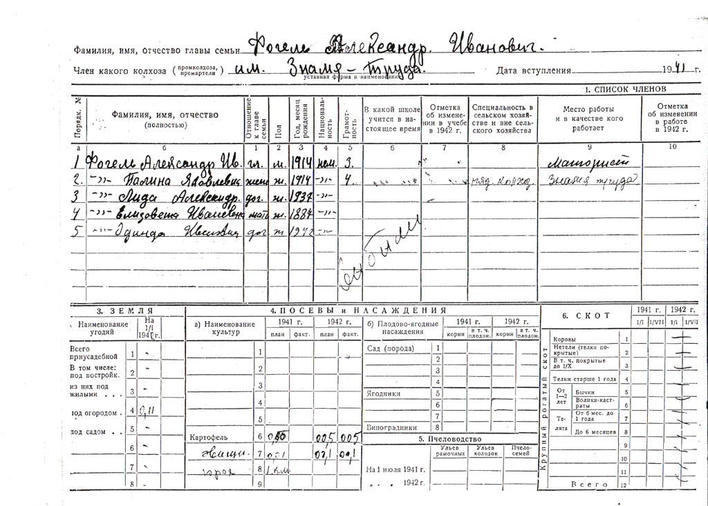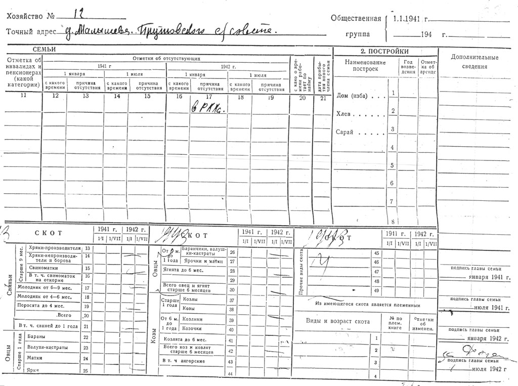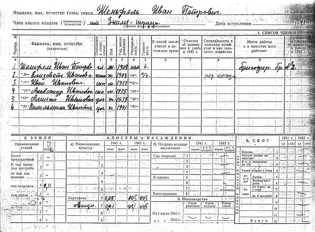 | 1 | Семья Адольф | небольшое хозяйство: 3 коровы, свиньи, куры | колхозники | работала в совхозе |