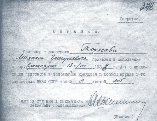 К этому времени УНКВД Красноярского края отправил списки обвиняемых для вынесения приговора на подпись членам Политбюро ЦК ВКП(б). 3 января 1938 года в списке обвиняемых по Красноярскому краю, отнесенных к 1 категории (расстрел) была фамилия Торосова М.Г.