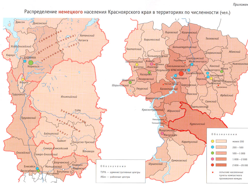 В исследуемом Курагинском районе проживают люди разных национальностей. Среди преобладающих национальностей, за исключением русских, - немцы. По карте распределения (2) немецкого населения Красноярского края в территориях по численности можно увидеть, что Курагинский район является одним из плотно заселенных немцами районов.