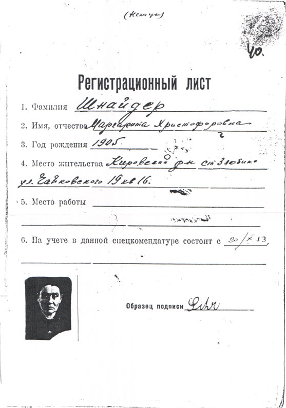 Депортация коснулась и семьи Шлюндт, проживавшей в селе Бауер Каменского кантона Саратовской области. Главу семьи Филиппа Шлюндта, занимавшего должность председателя сельпо, расстреляли в 1938г. по обвинению в проведении антисоветской агитации (в 1945г. реабилитирован прокуратурой Саратовской области). На руках его жены Евы – Елизаветы Адольфовны - осталось 5 детей: Ганна (1926г.р.), Мария (1928г.р.), Яков (1930г.р.), Амалия (1939г.р.) и Эмма (1935г.р.).