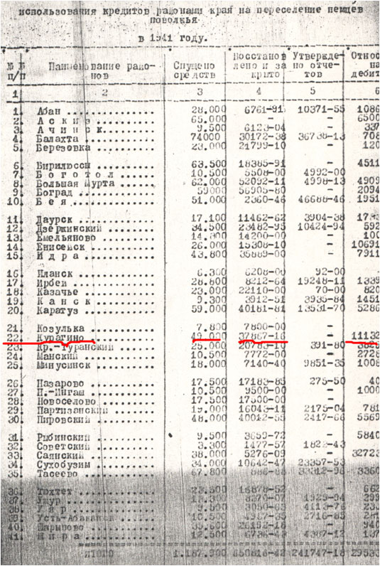 В Курагинском районе расселение депортированных немцев проводили в сельсоветах: Мокинском, Детловском, Грязнухинском, Поначевском, Курагинском и др.; в населенных пунктах с.Курагино, д.Мокино, с.Поначево, с.Грязнуха, Малая и Большая Ирба и др. Всего в район на 01.12.1941 г. прибыло 1940 человек. (8)