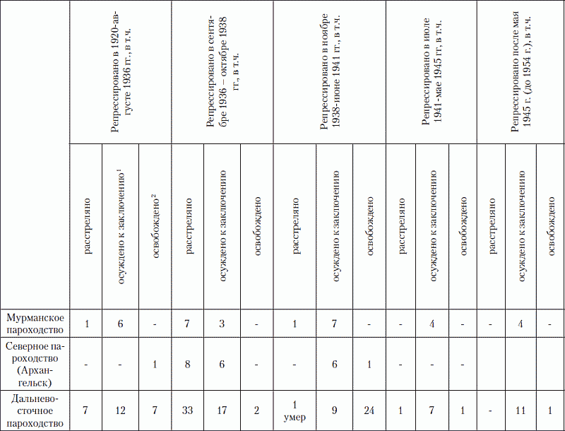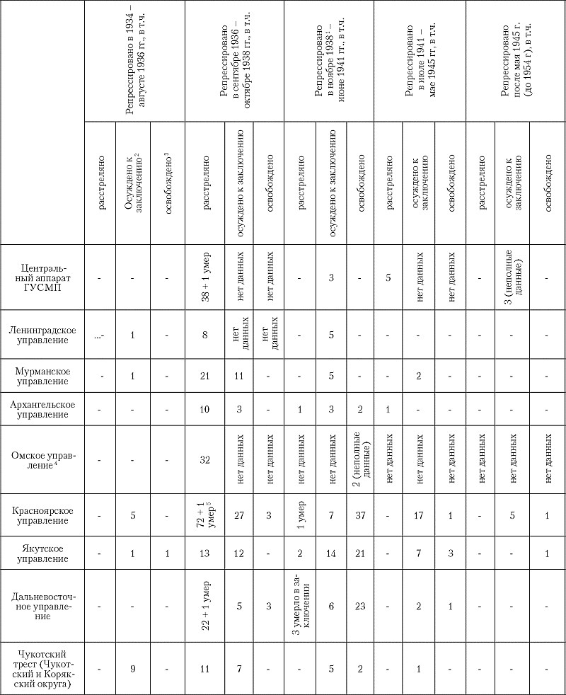При выявлении репрессированных, имевших отношение к работам на Советском Севере, мы не ограничивались только работниками Главного Управления Северного морского пути (ГУСМП) или иных организаций, прямо связанных с работами в Арктике, но включали в их число некоторых работников Наркомата водного транспорта (НКВТ), Гражданского Воздушного флота (ГВФ) и Аэрофлота, Гидрометеорологической службы СССР, работавших в арктических районах геологических, топографических, геодезических и картографических организаций и арктических предприятий. В этот же список вносились представители ряда профессий, которые могли иметь отношение к работам в Арктике. В список включены работники организаций, занимавшихся хозяйственным освоением Севера до образования ГУСМП и параллельно с ним: Акционерного общества «Аркос», «Комсеверпути», Акционерного Камчатского общества Наркомрыбпрома (АКО) и «Интегралсоюза» («Аркос» или Arcos Lnd – акционерное торговое общество, учреждено в Лондоне в 1920 году, было представителем советских внешнеторговых организаций, осуществляло импортные и экспортные операции, активная деятельность прекратилась в 1927 году после разрыва дипломатических отношений между Англией и СССР. «Комсеверпуть» или Комитет Северного морского пути – создан в 1920 году при Сибирском ревкоме, затем в подчинении Наркомторга – Всесоюзное экспортно-импортное и транспортно-промышленное объединение, ликвидировано в 1933 году с созданием Главного управления Северного морского пути. Акционерное Камчатское общество, акционеры – государственные учреждения, создано в 1927 году для противодействия японским рыбопромышленникам, основная деятельность – развитие экономической жизни Камчатки, Охотского побережья и Чукотско-Анадырского края, в основном же занималось добычей и переработкой рыбы; ликвидировано в 1945 году. «Интегралсоюз» – союз интегральных, промыслово-охотничьх и рыболовных кооперативов – специальная форма кооперирования народов Севера, объединял все виды кооперации, создан в 1927 году, ликвидирован в 1936 году. – прим. авт. по разным источникам) . Для Мурманска, Архангельска и Владивостока список дополнен руководящими работниками бассейновых морских пароходств (соответственно Мурманского, Северного и Дальневосточного), судоремонтных (в Мурманске – только судоремонтный завод Севморпути) и судостроительных предприятий, некоторых контор снабжения. Для Омска, Красноярска и Якутска в список вносились руководящие и квалифицированные работники речных пароходств – Иртышского, Енисейского и Ленского соответственно.