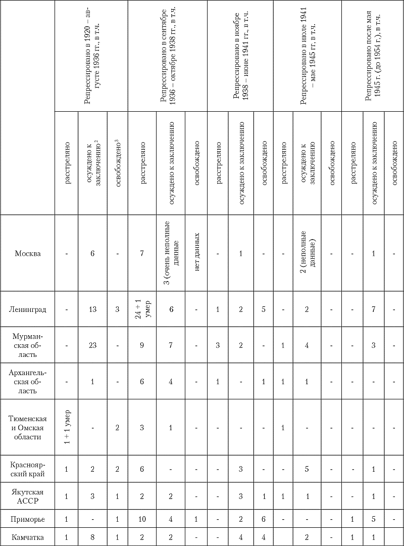 Насколько нам известно, попыток выяснения масштабов репрессий среди советских полярников, «покорителей Арктики», как их тогда называли, не предпринималось, и предлагаемая сводка выявленных репрессий среди них – лишь подступ к теме. Источниками информации для настоящей работы послужили «Книги памяти жертв политических репрессий» тех регионов, где в основном жили и (или) работали полярники: Москвы [«Бутовский полигон», «Ваганьковское кладбище», «Донское кладбтще», «„Коммунарка“», «Москва: Яузская больница» ], Ленинграда [«Ленинградский мартиролог» ], Мурманской [«Книга памяти … Мурманской области» ], Архангельской, включая Ненецкий национальный округ [«Поморский мемориал» ]. Иркутской [«Жертвы … Иркутской области» ] и Омской [«Забвению не подлежит» ] областей и Республики Саха (Якутия) [«Книга памяти … Республики Саха-Якутия» ]. Несколько фамилий расстрелянных добавляет к «Поморскому мемориалу» (Архангельская область) брошюра Ю.Дойкова [Дойков Ю. ]. Однако этот источник ограничен по времени (1918–1942 гг.), в нём не указаны формулировки обвинения, сведения об осудившем органе, нет и точной даты расстрела (указан только год). Изданный «Мемориалом» в 2004 году компакт-диск «Жертвы политических репрессий» (существенно дополнен в издании 2007 г. [«Жертвы политических…» ]) содержал уже электронные «Базы данных о жертвах репрессий» Приморского края (во Владивостоке дислоцировалось Дальневосточное управление ГУСМП) [«База данных … Приморского края» ] и Камчатской области (включая Корякский и Чукотский национальные округа) [«База данных … Камчатской области» ]. По полноте и информативности они не уступают «Книгам памяти», даже превосходят некоторые из них. Из «Книг памяти жертв политических репрессий» тех регионов, северные районы которых были сферой исследований и хозяйственного освоения в 1930–40-е годы, в нашем распоряжении имелся источник по Тюменской области [«Книга расстрелянных…» ], в 1-м томе которого содержатся сведения о репрессированных работниках Тобольского отделения ГУСМП, а во 2-м приводятся данные, в частности, по Ямало-Ненецкому национальному округу, но этот источник содержит лишь сведения о приговорённых к расстрелу и лишь в 1937–1938-м годах и не приводятся формулировки обвинения или вменённые статьи Уголовного кодекса. В Республике Саха (Якутия) изданы два тома «Книги памяти» [«Книга памяти … Республики Саха-Якутия» ], завершено ли это издание – неясно. В Красноярске издано пять томов «Книги памяти» [«Книга памяти … Красноярского края» ] в алфавитном порядке до буквы «М» включительно, что, по нашим оценкам, составляет примерно 60 % от общего числа репрессированных в крае. Сведения о нескольких лицах, имеющих отношения к освоению Арктики, содержатся в «Книге памяти Хабаровского края» [«Хотелось бы всех…» ]. Вряд ли завершена работа по составлению «Расстрельных списков» по Москве, а к спискам осуждённых к заключению или ссылке практически не приступали. Весьма проблематичен как источник «Ленинградский мартиролог»: во-первых, несмотря на обозначенный в названии временной период (1937–1938), изданные пять томов включают и репрессии более раннего времени, причём отображение их полноты вызывает сомнения. Во-вторых, пять томов вмещают лишь репрессии до конца 1937-го года, хотя, как показывают данные по другим регионам, наибольший