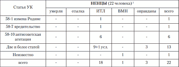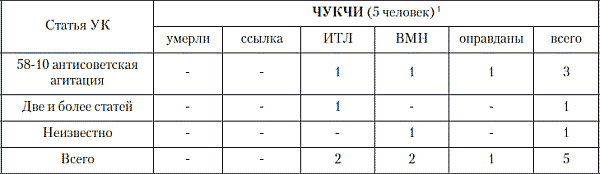 В обвинениях чукчей, как и в обвинениях большей части малых северных народов, преобладает «агитация» и «пропаганда» (шесть, а то и все семь из семи случаев), в одном случае зафиксировано общеуголовное, а не политическое, преступление – убийство.