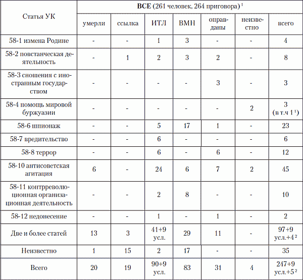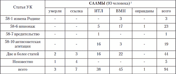 Таким образом, в 1937–1938 гг. было репрессировано 58 саамов, в т. ч. одна женщина. Из них к высшей мере наказания приговорены 42 человека, пятнадцать – к десятилетнему и один – к восьмилетнему сроку заключения в ИТЛ. Средний возраст репрессированных – 42 года, самому молодому из них – 20 лет, самому старшему – 73 года. По обвинениям в шпионаже или содержащем шпионаж (ст. 58–6 УК) было осуждено 33 человека, по обвинением в антисоветской агитации или содержащим таковую (ст. 58–10 УК) – тоже 33 человека, обвинений в участии в контрреволюционных организациях (ст. 58–11 УК), все в сочетаниях с другими обвинениями – 28, в повстанческой деятельности (ст. 58–2 УК), тоже в сочетании с другими обвинениями – 11, в измене родине (ст. 58–1а), в т. ч. в сочетании с другими обвинениями – 4, по одному обвинению (в сочетании с другими) было по ст. 58–4 УК – «оказание помощи мировой буржуазии», по ст. 58–9 УК – «диверсии» и ст. 58–7 УК – «вредительство». Если обвинение в «антисоветской агитации» было для следователей НКВД «дежурным» и предъявлялось большинству обвиняемых по всей стране, то обвинение в «шпионаже», куда более редкое, для советских саамов явно геополитически детерминировано. Это же можно сказать об аномально высоком числе обвинений в повстанческой деятельности, частого вообще для национальных окраин и казачьих регионов СССР, и для его северных территорий, обычно прошедших сложную историю гражданской войны, установления советской власти и коллективизации. Характерно, что саамам практически не предъявлялись обвинения, столь частые в промышленных районах СССР: во вредительстве (ст. 58–7 УК), диверсиях (ст. 58–9 УК) и терроре (ст. 58–8 УК).