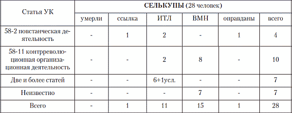 Как видим, спецификой обвинений юкагиров были обвинения в повстанческой деятельности (три случая из семи), стандартном «участии в контрреволюционной организации» (три случая), столь частая в других случаях антисоветская агитация инкриминирована лишь в одном случае, а в экзотическом для Якутии шпионаже обвинён житель Ленинграда.