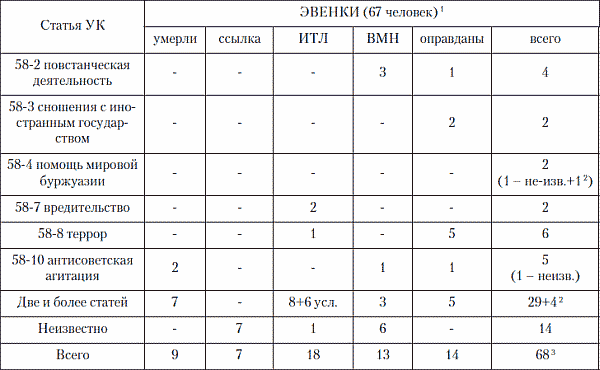 В северной Якутии в 1929–1935 гг. (напомним, что «Большой террор» не затронул здесь эвенков) к высшей мере наказания были приговорены четыре человека, к десяти годам заключения в ИТЛ – двое, к пяти годам – двое, к трём годам – пятеро, к трём годам заключения условно – шестеро, в наказание засчитан срок предварительного заключения – пятерым, запрещено на три года проживание в северных районах Якутии – семерым, в отношении восьмерых дело по недоказанности обвинения и реабилитирующим обстоятельствам дела прекращены. В эти данные не включён осуждённый в 1946 году А.К.Николаев (см. выше ). На Таймыре, где репрессии проходили в основном в период «Большого террора», положение иное: к высшей мере наказания осуждены девять эвенков, к заключению в ИТЛ не приговорён ни один, освобождёны по прекращении дел (в 1939 году) – трое, но умерло в заключении семеро. В 1939–1941 гг. из таймырских эвенков осуждены к семи годам ИТЛ – один, к шести годам – один, оправданы судом – трое, умерли в заключении – двое.