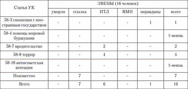 В нашем основном источнике [«Жертвы репрессий …» ] зафиксировано 92 случая репрессий против эвенов, на долю северных эвенов приходится 16 случаев. Любопытно, что в годы «Большого террора» не был репрессирован ни один из северных эвенов.