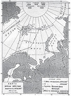 Задача перед «Красиным» была поставлена простая и ясная – выйти в море через 104 часа (сначала сгоряча назвали днём выхода 14 июня). Только что назначенные капитан ледокола К.П.Эгге (перед этим он несколько лет командовал ледоколом «Ленин», ранее – «Александр Невский») и комиссар экспедиции военно-морской инженер и дипломат П.Ю.Орас сформировали команду: каждое советское судно, оказавшееся в Ленинграде, получило разнарядку командировать на «Красин» такое-то число таких-то специалистов. Руководитель экспедиции Самойлович взял на себя обеспечение продуктами и снаряжением. Самое удивительное, что в срок уложились, вышли 16 июня даже на 13 минут раньше. Правда, и за Кронштадтом продолжали принимать на борт с барж грузы, и до самой Норвегии их разбирали, отделяя наваленный на палубе уголь от капусты, запчастей к самолёту и многого прочего. Море, к счастью, было спокойно – ведь даже небольшая качка была опасна для хаотично нагруженного корабля. 1-го июля «Красин» подошёл к району поисков к северу от Шпицбергена и вступил в борьбу с тяжёлыми прибрежными льдами. Доставалось всем, но сущим адом была «машина» – кочегаров и машинистов после вахты выносили на палубу полуживыми.