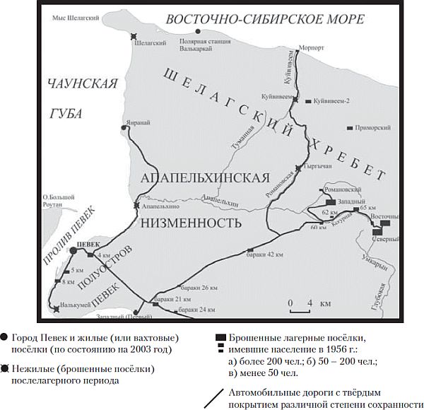 Северный рудник в окрестностях Певека состоял из многих лагпунктов – собственно шахт (посёлки Северный, Восточный, Западный, Романовский), где добывалась урановая руда, отдельных промышленных и разведочных штолен во многих местах, обогатительной фабрики в пос. Первом (теперь – Западный), а также отдельных лагерных объектов – строительных, штрафных, венерических и т. д. Все они соединялись системой автодорог, проезжих круглогодично, за исключением недолгих периодов снежных заносов и весенних паводков. По дороге вывозилась руда с рудников на обогатительную фабрику в пос. Первом и далее в порт Певека.