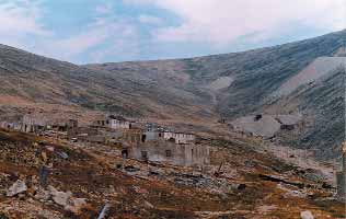 Третья часть посёлка – производственная зона – шахты (скорее, штольни), надшахтные постройки, построенные теми же методами, что и жилые дома, отвалы и различные коммуникации. Три штольни находятся на нескольких уровнях от днища долины до средней части склона. Друг с другом они соединены тропами (см. фото), а от самой нижней штольни вертикально вверх на вершину горы ведёт узкая насыпь, видимо, канатного (вагонеткового) рельсового подъёмника. Рельсы отсутствуют, но заметны следы шпал. Крутизна каменистого склона с насыпью достигает 30–35°, а на отдельных участках – и более. Поверхность отвалов высотой до 10 м выровнена. Вокруг всё забросано железным мусором, бочками и досками. Нижний отвал перекрывает верховье реки, которое 9 августа 2003 года было абсолютно сухим. В правом борту долины ниже посёлка находится ещё пять отвалов меньшего размера, возвышающихся над огороженным колючей проволокой пространством с двумя небольшими каменными зданиями.