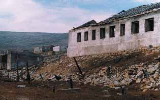 Дома стоят в два ряда вдоль дороги, с другой её стороны – ещё одни развалины. Ближний к дороге ряд состоит из более крепких зданий с большим количеством цемента между плоскими гранитными глыбами, на окнах – решётки. Иногда к каменным стенам пристроены деревянные строения, тоже развалившиеся. Крыши у всех строений были деревянные. В развалинах нашли приют многочисленные зайцы. По-видимому, лагерь был создан для строителей и эксплуатационников автодороги.
