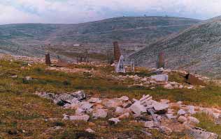 Полувыемкой дорога врезана в склон, покрытый гранитными глыбами. Каменные обломки двигаются гравитационными и мерзлотными процессами, и постепенно дорога становится непроезжей даже для «Урала». Только гусеничная техника способна по ней забраться на перевал высотой около 900 м. Здесь сформировалась выровненная поверхность шириной до 700 м, покрытая щебнисто-глыбовым материалом, практически лишённая растительности и безводная. Она вся изрезана дорогами различного возраста, идущими в различных направлениях и соединяющими несколько групп строений, стены которых, сложенные из обломков гранитов, неплохо сохранились. И сама поверхность, и её склоны пересечены довольно густой сетью геологических канав, образующих причудливый рисунок.