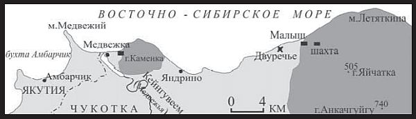 Описанными выше список островов уранового ГУЛАГа Западной Чукотки, увы, не исчерпывается. О существовании каких-то лагерей и шахт на юго-восточном побережье Восточно-Сибирского моря, примерно в 280 км западнее Певека и в 50 км восточнее устья р. Колымы (см. карту), автор впервые услышал в 1994 году в переложении рассказа местного охотника, сейчас уже умершего.