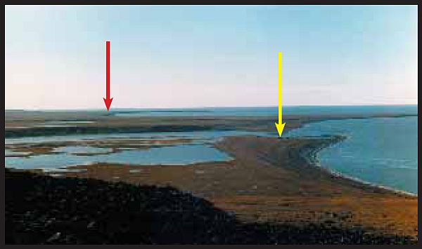Берег Восточно-Сибирского моря восточнее устья р. Колымы. Красной стрелкой на
