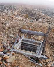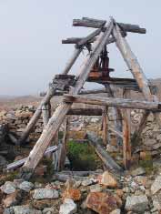 Поднявшись по сложенному гранитами склону до высоты 240–260 м по размытой водой старой дороге, ранее использовавшейся гусеничным транспортом, мы обнаружили, что расположенная здесь выровненная площадка шириной около 700 м покрыта равномерной сетью геологических канав и отвалов высотой до 1 м вдоль них. Среди канав помещается сама шахта и деревянная вышка с блоком для подъёма клети с людьми и руды (см. фото). Примерно в ста метрах в канаве – меньший по размеру вход в вентиляционную (видимо) шахту, над которой сохранился деревянный ворот, аналогичный колодезному. Рядом с шахтами – более высокие белёсые отвалы из невыветрелых гранитных глыб, сверкающие под солнцем. Сами остатки механизмов окружены сложенными из гранитных блоков частично разрушенными стенками (см. фото). Из камней торчат столбы освещения. На поверхности множество досок, брёвен, мелкого железного лома, бочек, проволоки. Похоже, что здесь никаких работ после оставления разведки не проводилось.
