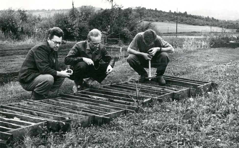 На полевых работах. Осмотр геологических проб (кернов). Середина 60-х годов