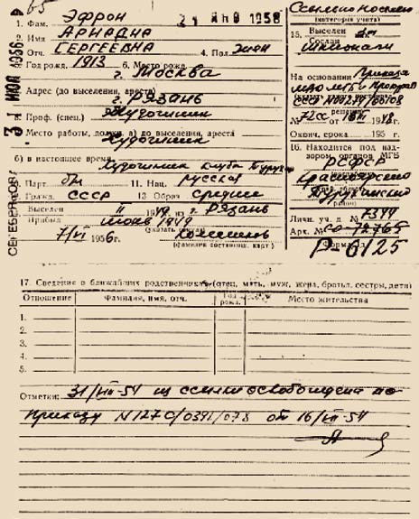 Интересны также материалы, касающиеся репрессий в отношении Льва Николаевича Гумилева, сына поэтов Н. С. Гумилева и А. А. Ахматовой, отбывавшего за антисоветскую агитацию ссылку в Норильлаге; Ариадны Сергеевны Эфрон, дочери С. Я. Эфрона и М. И. Цветаевой, отбывавшей ссылку в Туруханске за шпионаж; Ольги Стефановны Буденной (в ссылке Михайловой) – жены легендарного маршала С. М. Буденного [35], Виктора Савельевича Крамарова – отца известного актера С. В. Крамарова [36] и многих других, чьи трудные судьбы оказались связаны с Красноярским краем.