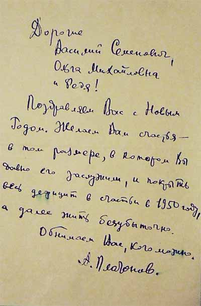 Письмо А.Платонова В.Гроссману (поздравление с Новым 1950 годом). Публикуется