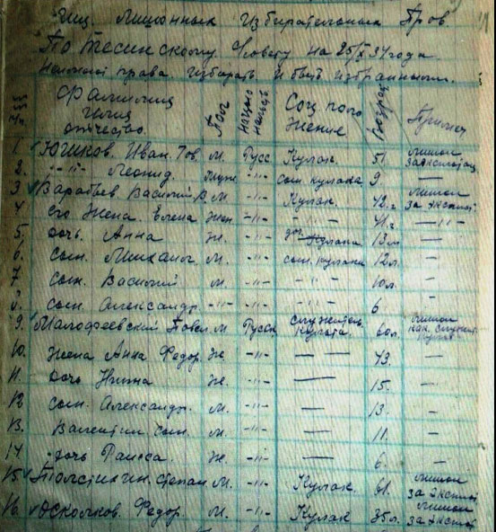 Эксплуатировали батраков, имели раньше посевы по 15 га, сейчас сельсовет выявленных кулаков лишил избирательных прав; кроме того даны твердые задания крепкозажиточным Семенову Ефиму, Бякову Даниилу, Юшкову Ивану, Бякову Егору, Ходакову Николаю, Зубкову Андрияну, Черных Макару, Машнину Лаврентию.