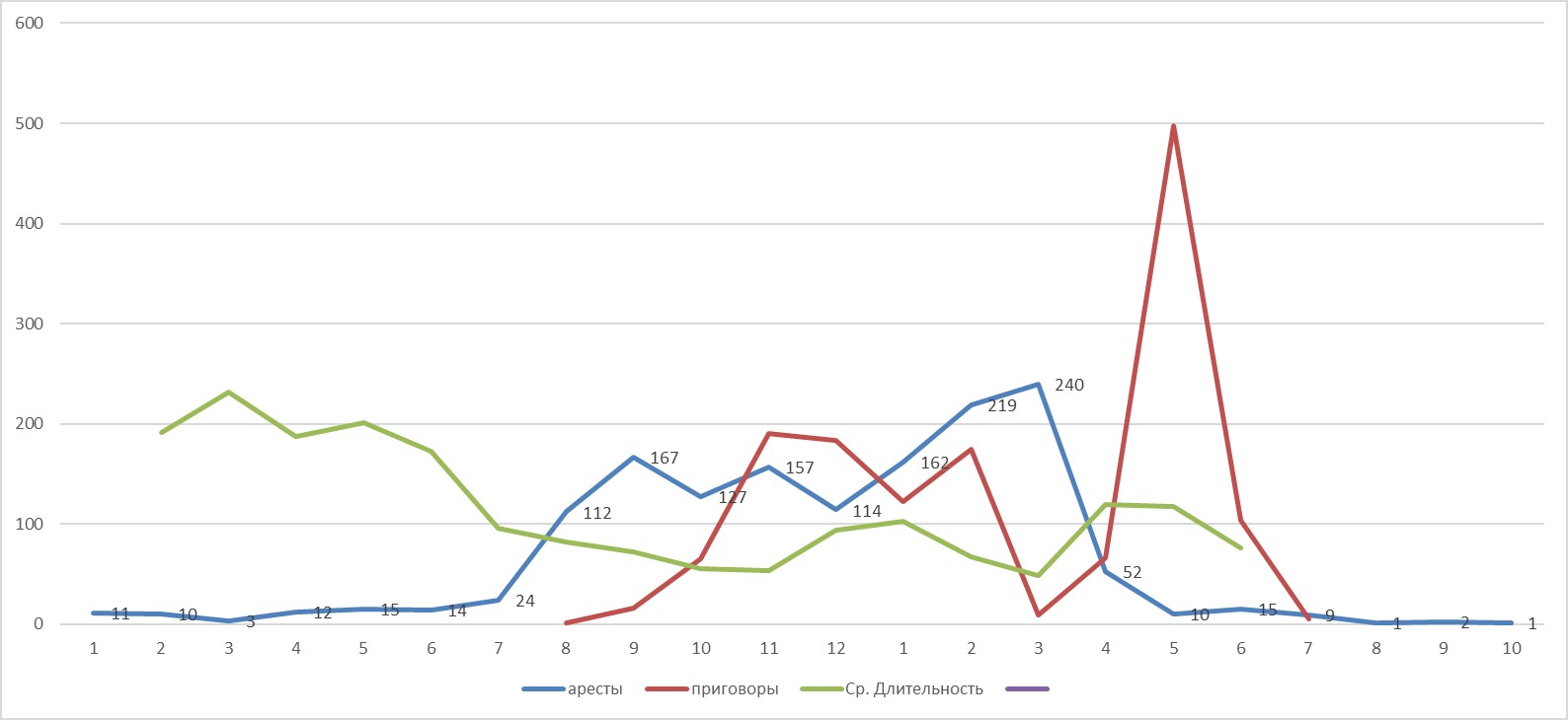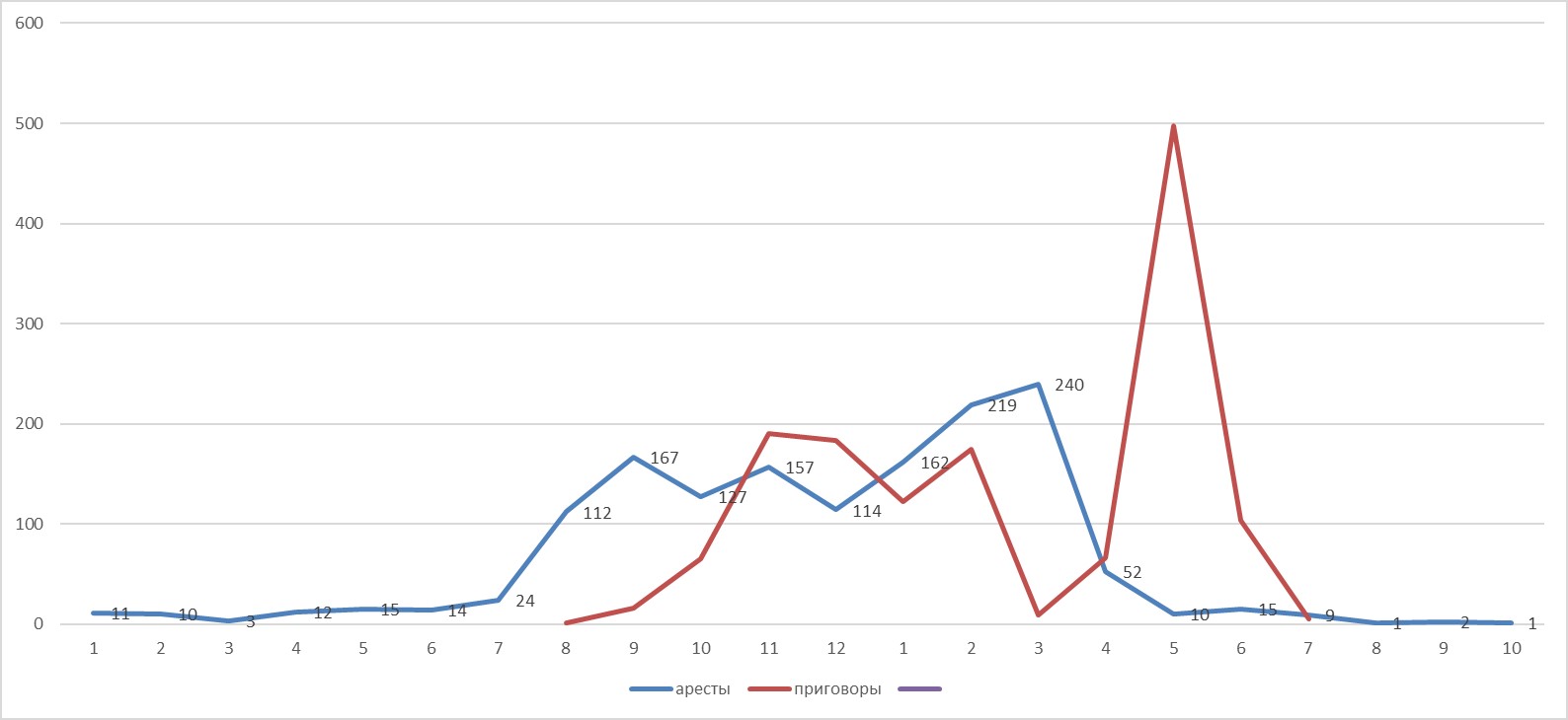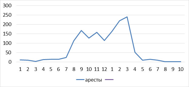 Рис. 1 Динамика количества арестов по польской операции. По оси Х – месяцы