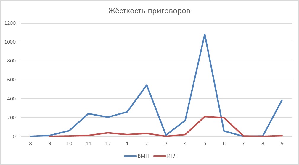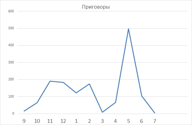 Характерен пик приговоров в мае 1938 года. Причина, видимо, техническая- «двойка» рассмотрела накопившиеся дела.