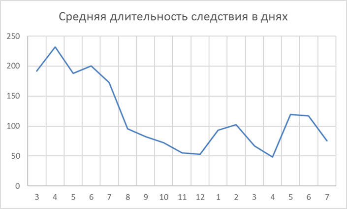 Рис. 4 Средняя длительность следствия в днях, то есть время в днях, прошедшее