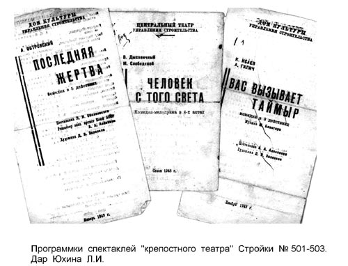 Мы проработали месяц в Игарке, и оперетта уехала в Норильск на гастроли, а мы (драма) в Ермаково - разделили нас. Дима Зеленков поехал с нами, потому что директор Алексеев был в драме, ну и, конечно, своя рука владыка, и он лучших артистов взял себе. В том числе и я поехал в Ермаково… Это было в сентябре. В Ермаково в такие же палатки брезентовые поселили. Мы их сверху снегом сверху засыпали и водой полили, и там бы жарко даже от двух буржуек. Прожили так мы зиму. В Игарке и Ермаково мы жили лучше, чем вольнонаемные. Кормили нас хорошо, работали мы по специальности в театре, что ещё надо?