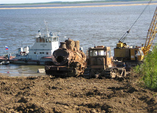 У берега пришвартовано судно «Ангара-88» с баржой, на которой установлен подъемный кран на гусеничном ходу, стоял бытовой вагон, на поддоне сложены кислородные баллоны, емкость с дизельным топливом, металлическая стрела, дизельный двигатель, доски. Между баржой и берегом установлены 5 железобетонных блоков, на которых от баржи на берег уложены 2 рельса. В 10-ти метрах от баржи напротив рельсов стоял бульдозер, металлические тросы от него тянулись к паровозу. Он стоял на металлической платформе в виде «лыж». Поврежденная обшивка придавала паровозу вид взъерошенного зверя, который упрямо сопротивлялся волочению. На берегу находились рабочие. Вскоре начался «осмотр места происшествия», и мы, музейщики, уже выступали в роли понятых. Было зафиксировано на видеокамеру все, что происходило на берегу. Состоялся также разговор с руководителями бригады Курейской ГЭС Н.И. Котовым и П.Ф. Кузьмицким, Они объяснили на видеокамеру, что находятся здесь в командировке уже несколько недель, направлены директором Курейской ГЭС В.Г. Бардюковым для транспортировки паровозов в посёлок Светлогорск. На вопрос о том, с какой целью вывозятся паровозы, они ответили, что глава администрации Туруханского района С.Г. Юрченко дала такое распоряжение, и что она намерена реконструировать эти паровозы для музея.