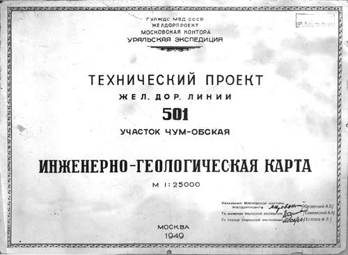 Карты, помещённые в этом разделе, являлись составной частью технического проекта железнодорожной линии участка Чум–Обская, который относился к Стройке № 501, разделённой позже на Стройку № 501 и Стройку № 503. Выходные данные на комплекте карт – Москва, 1949 – лишний раз подтверждают тот факт, что техпроект этого участка (впрочем, как и всех последующих) был готов уже после того, как устройство насыпи и укладка дороги заключёнными были, собственно, завершены – движение на участке Чум–Обская было открыто ещё в декабре 1948 года...