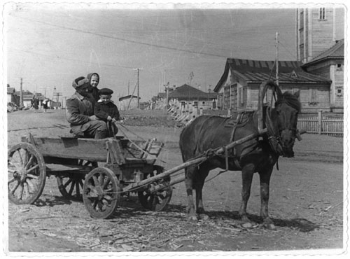 Маленький Саша с отцом на подводе возле магазина.