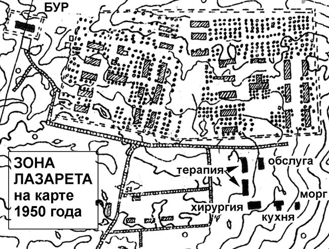 По зоне лазарета писать абсолютно нечего, он привязан точно, и план расположения зданий точен, включая перпендикулярно расположенную хирургию. Терапии без «изысков» - обычные бараки с выделенной дощатой дежуркой. В зоне лазарета дежурка посередине (ночью я на топчане в ней спал), в старом лагере дежурки располагались в начале барака. В зоне лазарета в обеих терапиях стояли топчаны, в общем лагере обычные нары, даже не «вагонки». В конце бараков были каптёрки. Больные находились в нижнем белье.