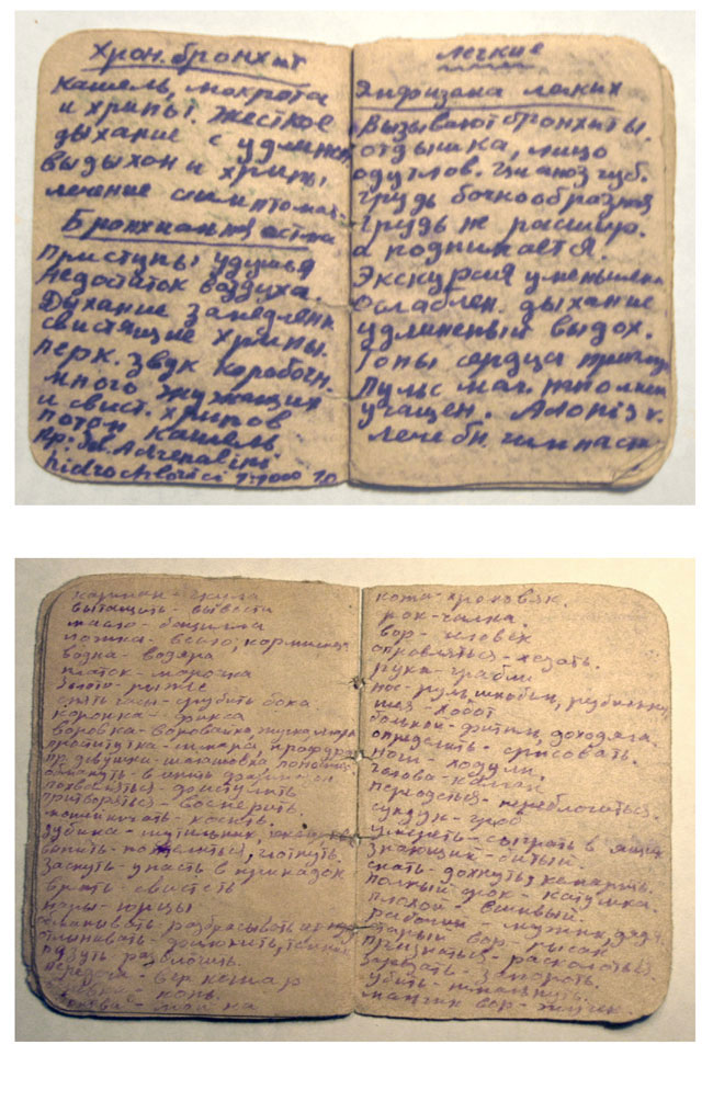 IX. Словарик медицинских терминов, написанный на обёртках от махорки в вагоне поезда, по пути из Ленинградской пересылки на Красноярскую.