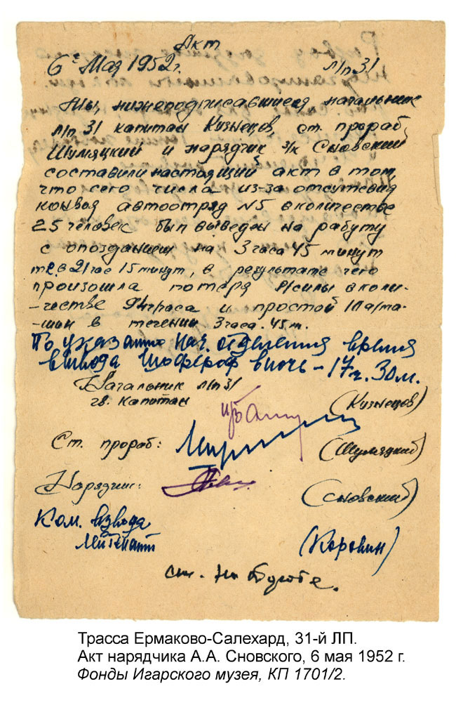 XII. Акт об опоздании и простое от 6 мая 1952 г., лагпункт № 6, нарядчик А.А. Сновский.