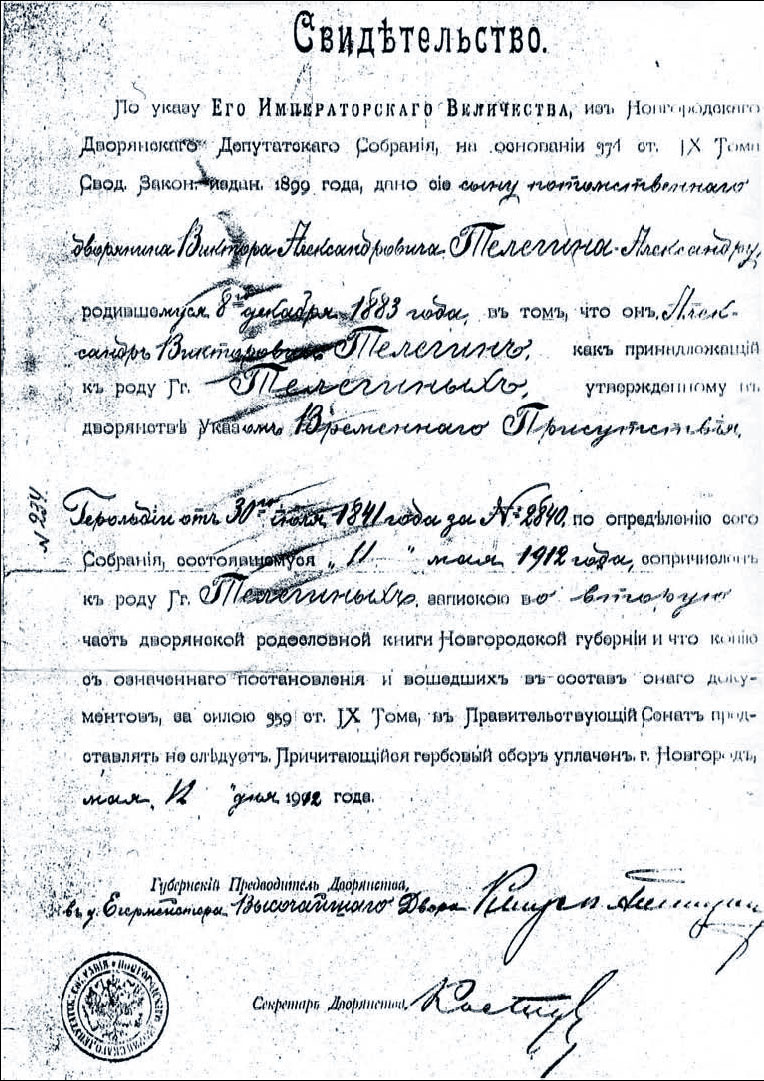 У красноярки Галины Ивановны Загревской, племянницы Александра Телегина, бережно хранятся два документа. На мелованной бумаге первого бланка витиеватым шрифтом напечатано, что свидетельство выдано по указу Его Императорского Величества сыну потомственного дворянина Александру, родившемуся 8 декабря 1883 года. Он принадлежит к роду господ Телегиных, о чем в мае 1912 года сделана запись в дворянской родословной книге Новгородской губернии. Это свидетельство заверил губернский предводитель дворянства.